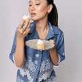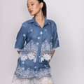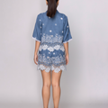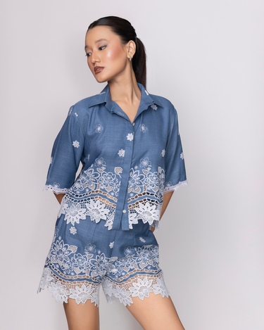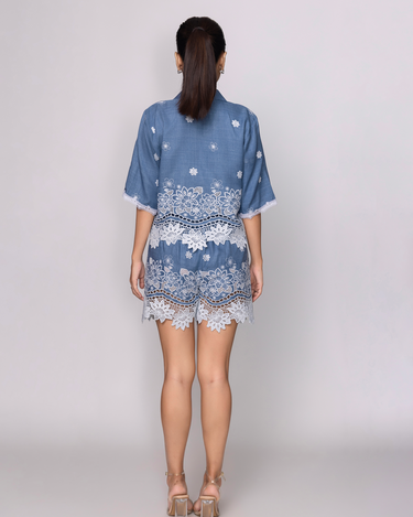 This light denim-toned shirt and shorts set features delicate white thread embroidery and ornate lace edging that adds soft contrast and artisanal charm.