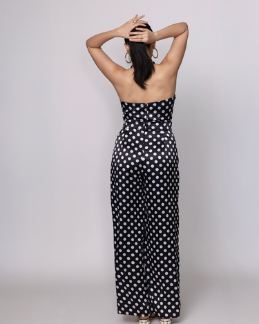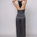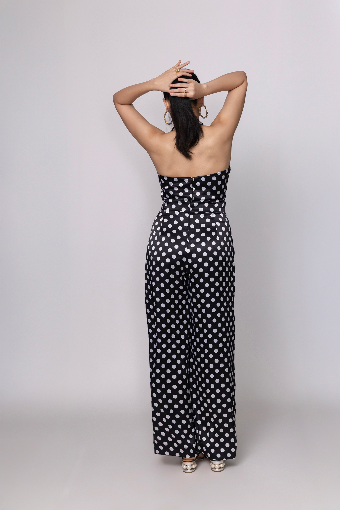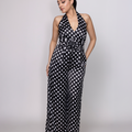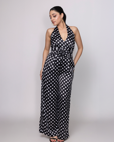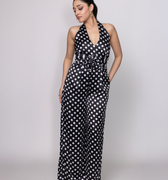 Polka dot jumpsuit-A halter-neck satin jumpsuit in classic polka dots, featuring wide-leg pants and a statement rosette cinching the waist.