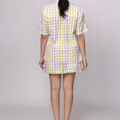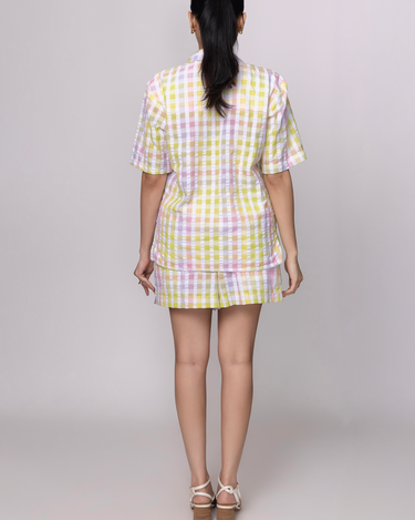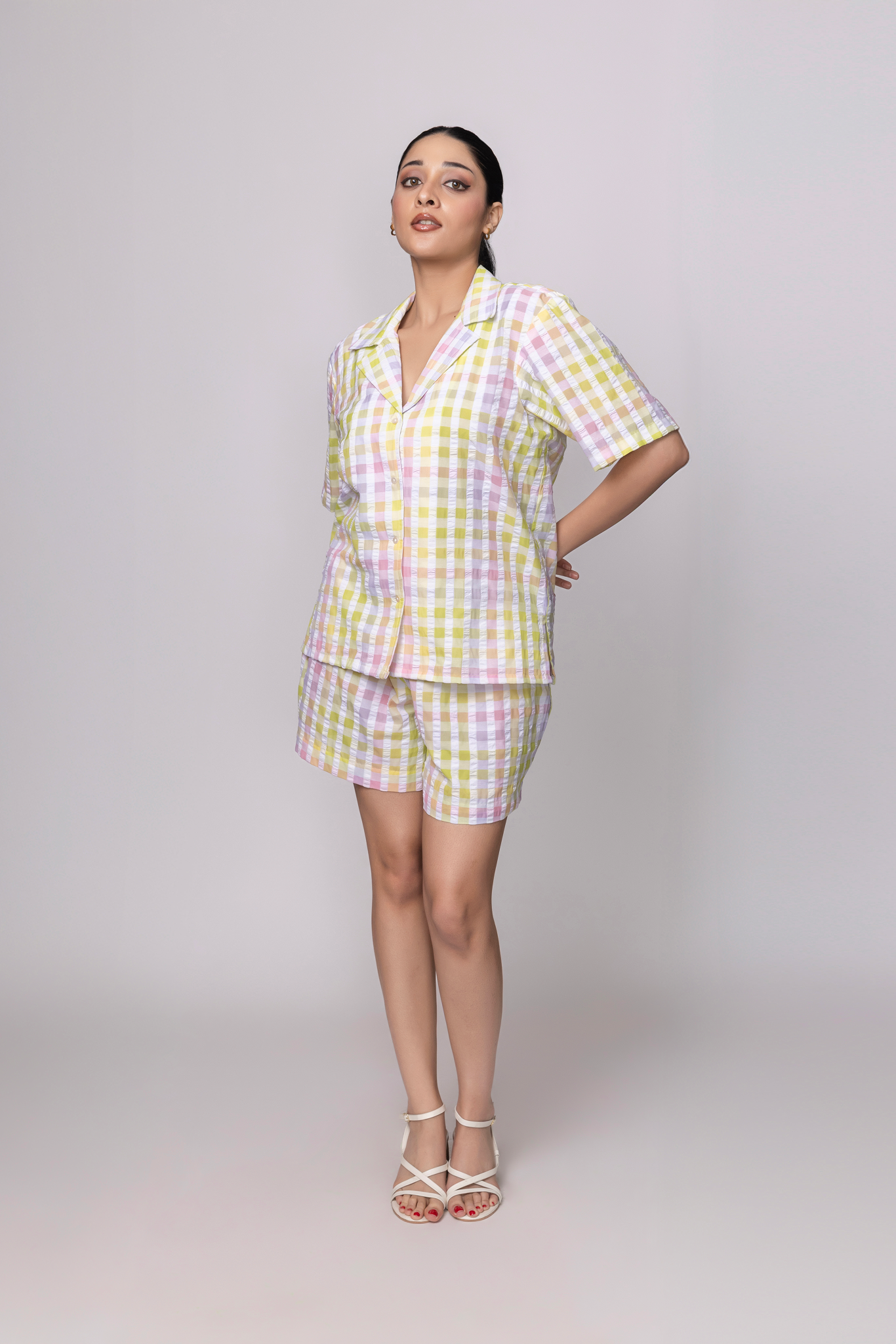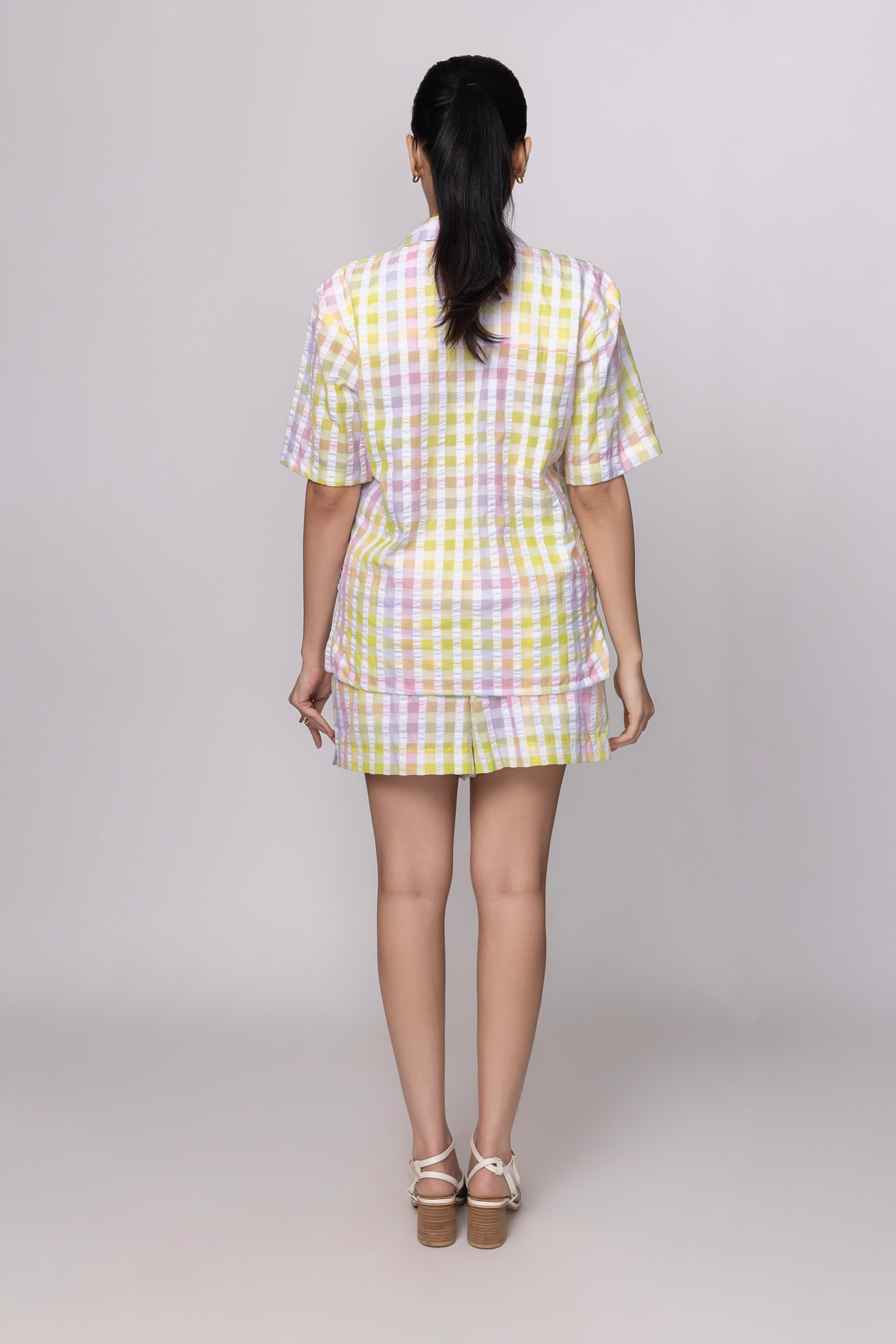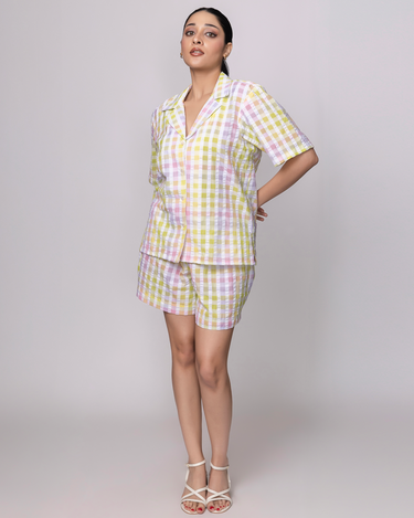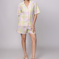 A breezy cotton co-ord in pastel plaid, featuring a relaxed camp-collar shirt and easy-fit shorts in lemon, blush, and lilac tones.