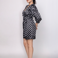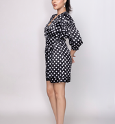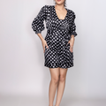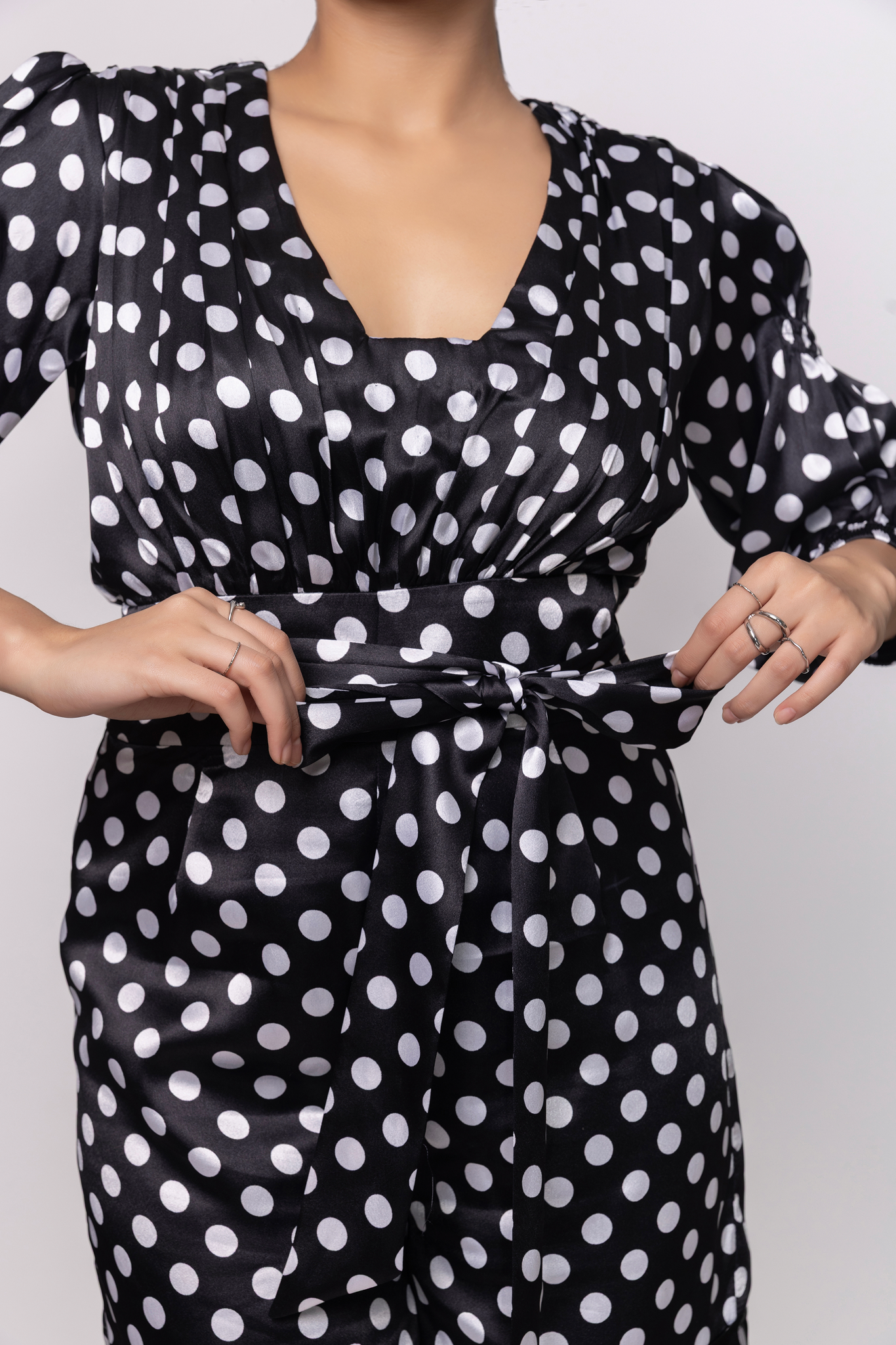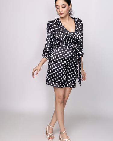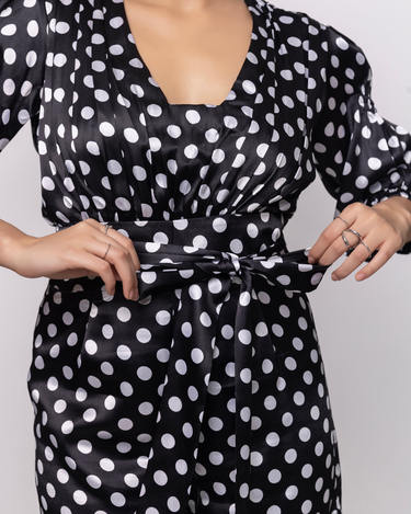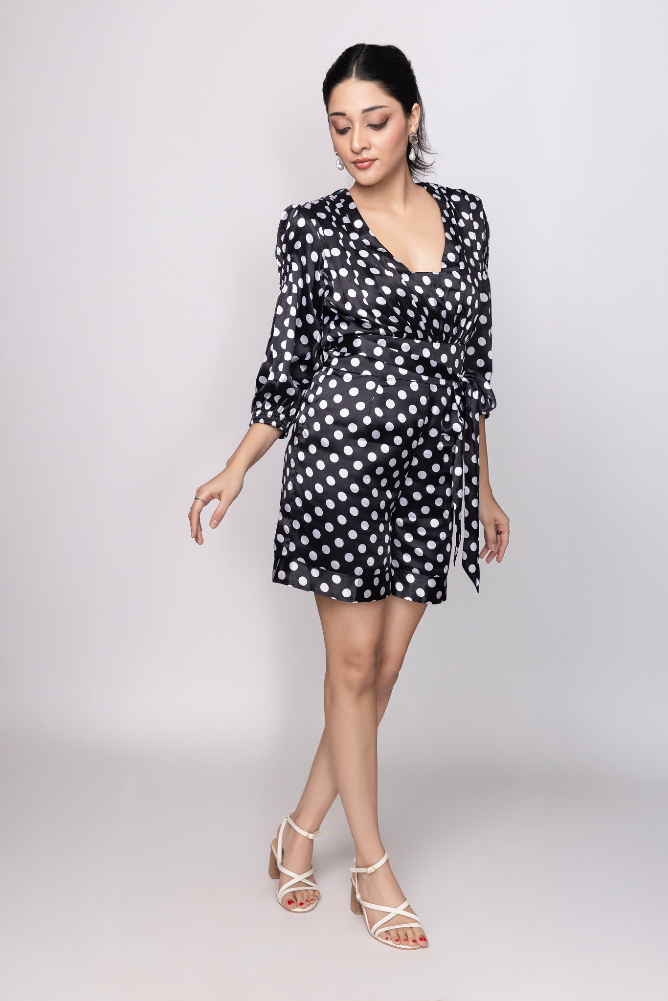Satin wrap jumpsuit with bold polka dots, puff sleeves, and a tie waist for a classic, flattering fit.